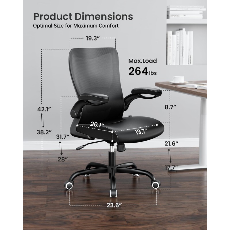 - 【Space Saving】The armrests of this desk chair can be flipped up 90° to fit different needs and save space. You can slide the chair under the desk when not in use. The armrests are contoured to match your arms’ shape and have soft padding to protect your wrists and elbows. The computer chair can be adjusted in height by 3.74 inches and swivel 360° for convenience.