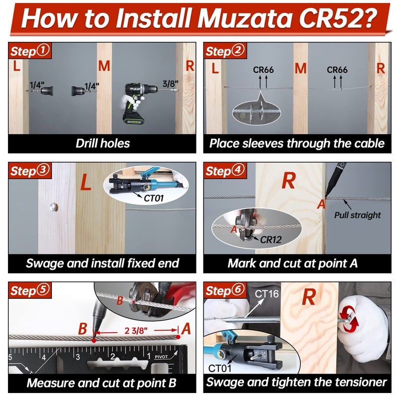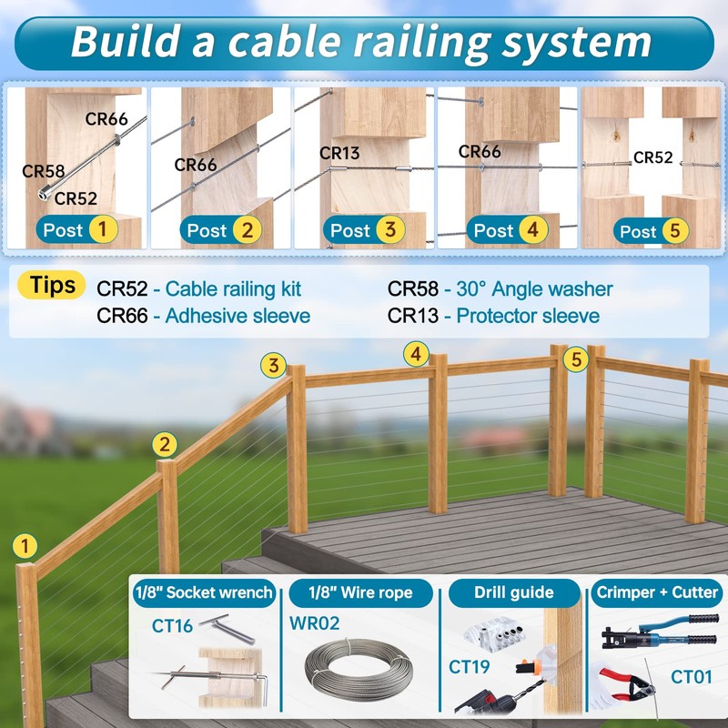 • Advice for constructing a system: To help you build a cost-effective cable railing system more efficiently, we recommend the following product combinations from Muzata, including tensioner CR52, angled beveled washer CR58, terminal CR24, 1/8" wire rope WR02, adhesive sleeve CR66, protector sleeve CR13, drill guide CT19, crimper and cutter CT01, socket wrench CT16