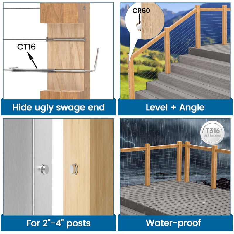 Marine Grade: This cable railing hardware is made of T316 stainless steel, which has excellent resistance to rust, corrosion and extreme weather, ideal for indoor or outdoor, even coastal applications