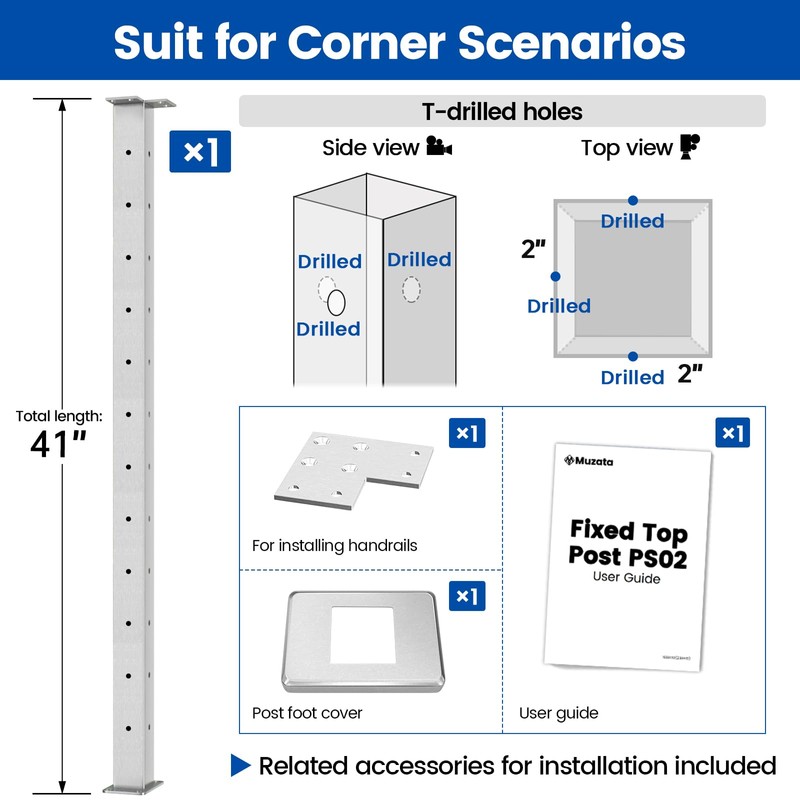 Muzata Brushed Corner Cable Railing Post T-drilled 42"x2"x2" Surface Mount One-Post Corner Solution T304 Stainless Steel Cable Railing System Kit Indoor Outdoor with Paper User Guide PS02 L34L