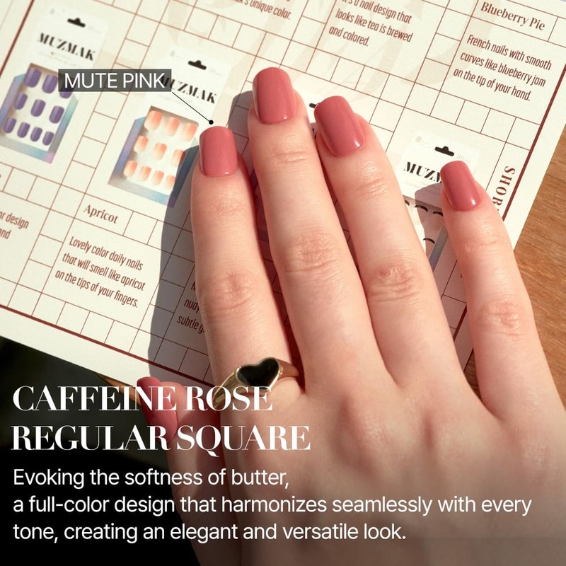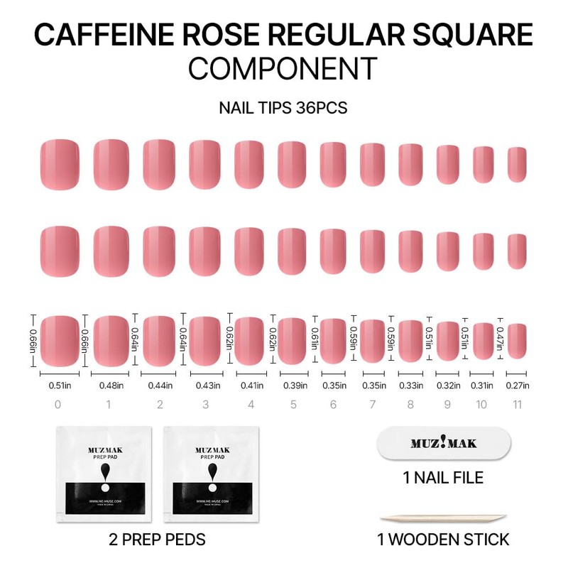 MUZMAK Reusable Press On Nails - Caffeine Rose - Long Coffin Press On Nails, Pink Fake Nails (Pack of 36)
