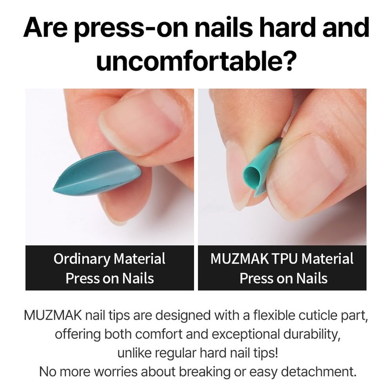 - REUSABLE FAKE NAILS: Muzmak press on nails are reusable, unlike traditional fake nails. Easily remove and reapply using nail adhesive for multiple uses without shape or quality compromise.