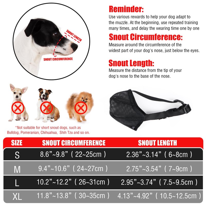 - Size of the muzzles for pets: measure the circumference of the dog's mouth and neck. We have different sizes for small, medium and large dogs. Please check the size chart and choose the right size. If you are undecided between two sizes, the larger size is more suitable. Please check before purchase.