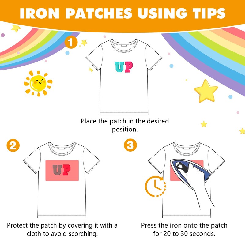 - Easy to Use: The chenille on patches can be sewn or ironed on. For iron-on application, follow these simple steps: First, position the patch where you want it and place a pressing cloth over it to protect the material. Next, set your iron to the “COTTON” setting (100-150 degrees) and apply heat for 20-30 seconds