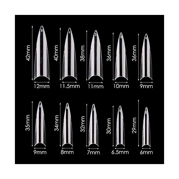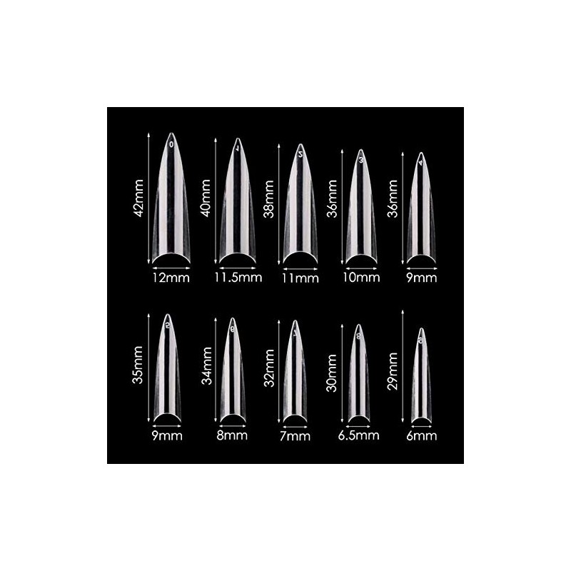 Mwoot 600 Pieces Long Stiletto Nail Tips, Sharp Ending Artificial Fake Fingernails Nail Tips for DIY Nail Salons, 10 Sizes (Clear)