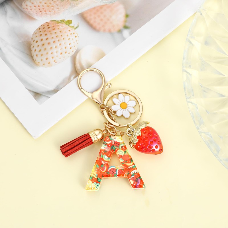 - Letter Keychain Initial: you will receive a keychain letter that is combined with a red tassel, a strawberry pendant, a daisy pendant and a key ring. These chic and harmoniously colour-coordinated items complement each other perfectly, add a stylish accent and add charm to your look.