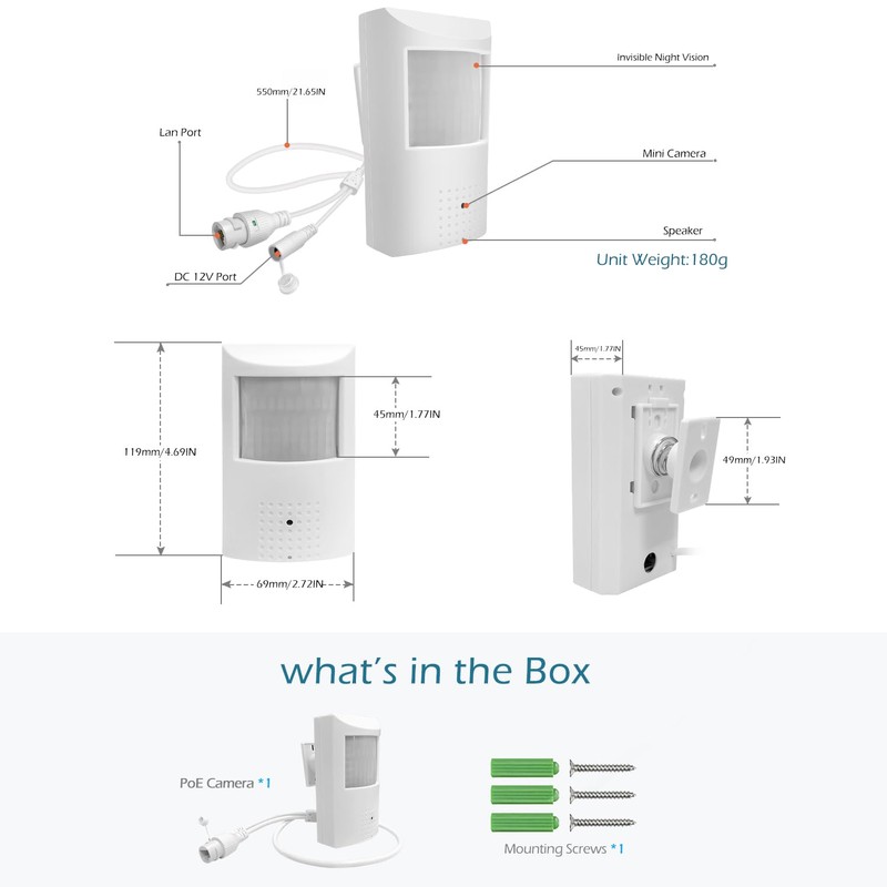 - 【4MP HD IP Camera】IP POE Security camera PIR Motion Detector, 4MP High definition resolution mini camera with high sensitive interline transfer 1/3" sensor which can brings you sharp and bright images.