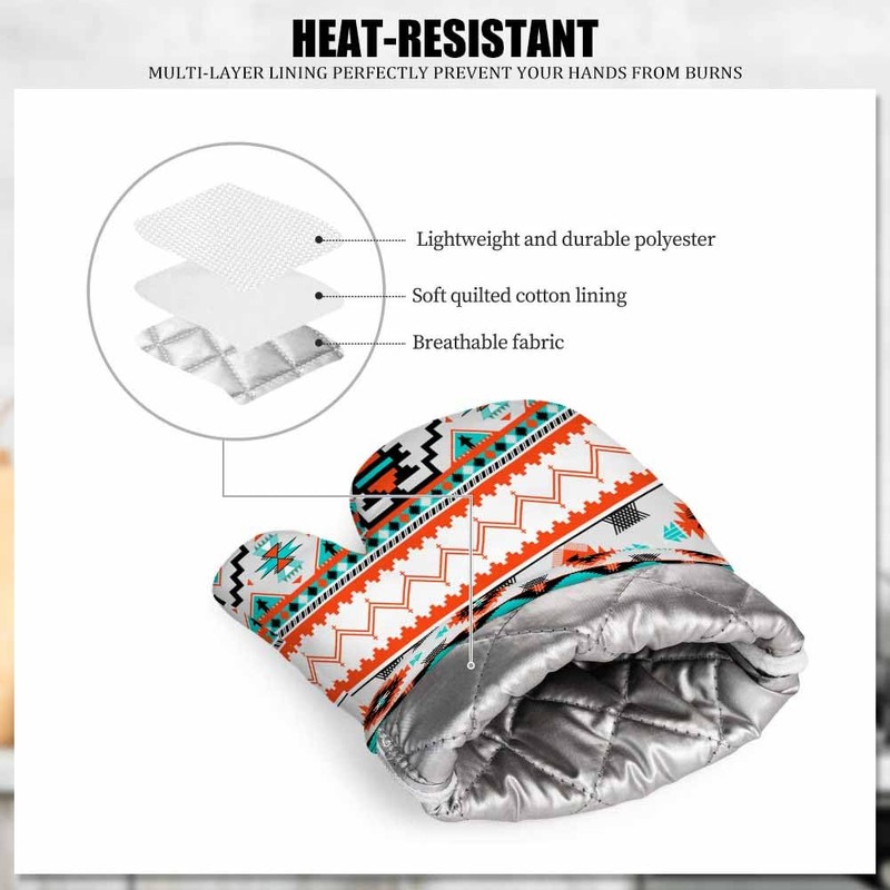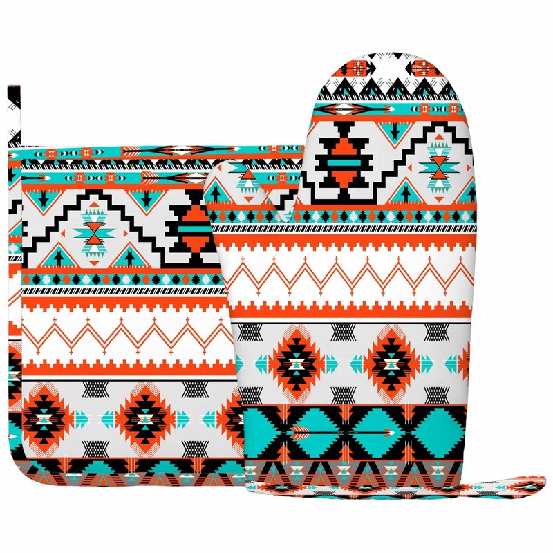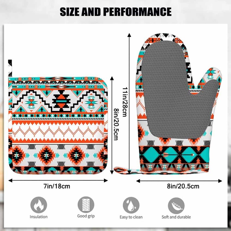 Mxocom Aztec Pattern Silicone Oven Mitts and Pot Holders Sets Geometric Ethnic Indigenous Tribal Colorful Striped BBQ Gloves for Kitchen,Cooking,Baking,Grilling