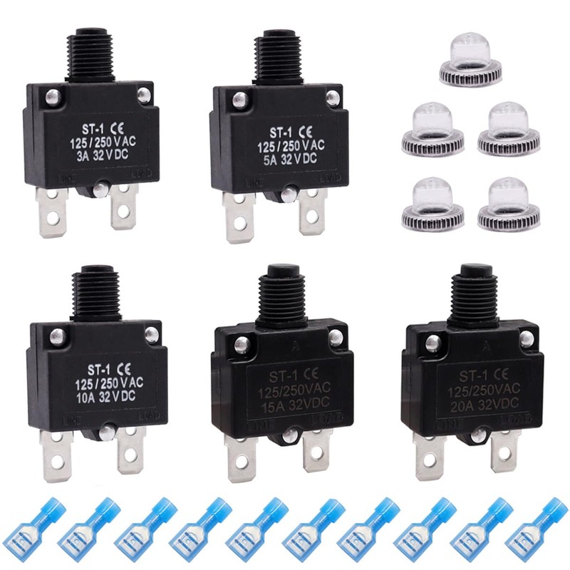 - Package Includes: 5 PCS thermal circuit breakers(3A,5A,10A,15A,20A)+5 PCS Waterproof Button Caps +10 PCS Quick Connect Terminals