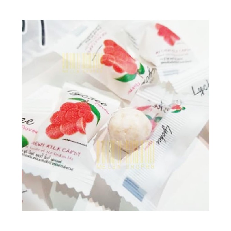Chewy Lychee candy Filled with Lychee flavored jelly. Milk candy with a soft texture. Sticky, unique Provides a mellow taste of fresh Durian. Perfectly blended with the aroma of Lychee. Suitable for all genders and ages Information for food allergies Contains milk, dairy products 100 tablets, size 360 grams. Expiration Date on Packaging DD/MM/YY