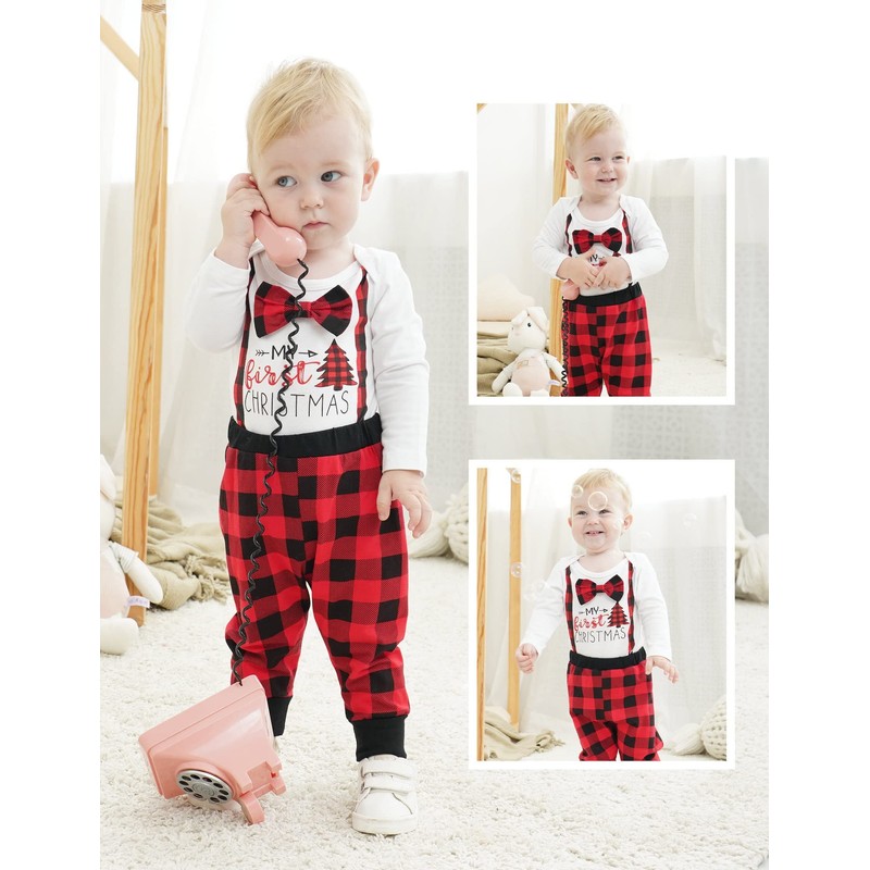 My First Christmas Newborn Girl Boy Xmas Outfits Bow Bodysuit Pants Plaid Hat Infant Christmas Clothes Set