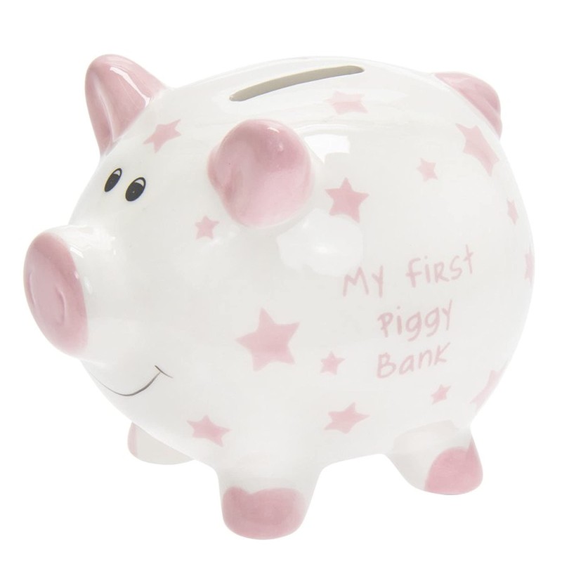 'My First Piggy Bank' Money Box White with Stars 12cm - Pink