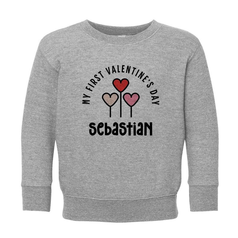 - Celebrate your little one’s first Valentine’s Day with this adorable custom design! Featuring the phrase "My First Valentine's Day" and personalized with the name “Sebastian” to celebrate!