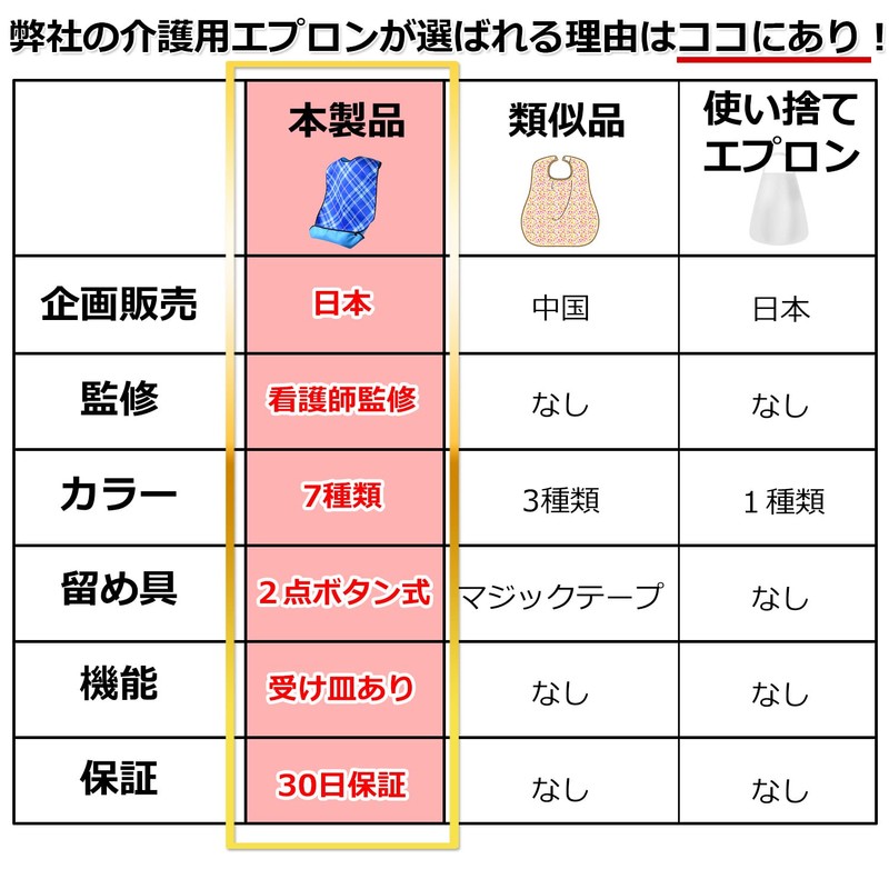 - Nurse supervised apron. The large design allows you to eat the food tray underneath. 2 buttons on the neck so that you can adjust it according to your physique. Since the clasp is a button type, there is no need to worry about the adhesive strength compared to Velcro types. We also have 7 colors to choose from, so you can choose from to make the most of your individual needs