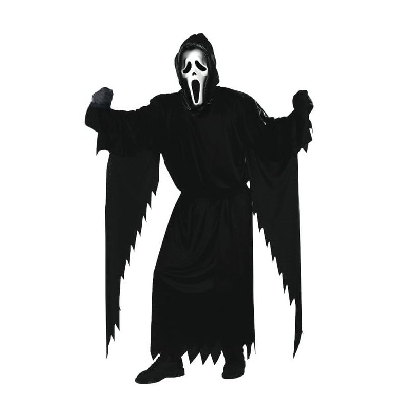 Scare all on October 31st dressed as one of the most iconic Halloween villains of all time with our licensed Scream GhostFace Adults Costume, complete with mask and gloves. Each adult's Halloween costume consists of a long black robe with jagged edges. Also included is a pair of black gloves. Our men's horror fancy dress is available in either standard (up to 44" chest) or plus size (up to 46" chest). We also offer an "aged" version of our standard costume which comes with a cracked look mask. Our Halloween fancy dress costume can be worn on all Hallow's eve and also makes a great choice for horror fright nights and scream cosplay.