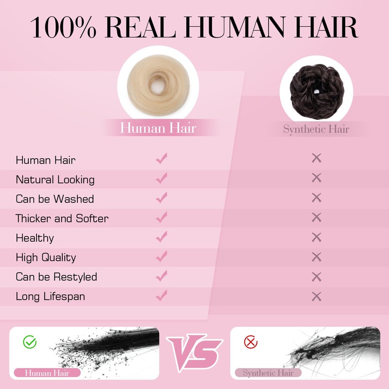 - 100% Real Human Hair - This hair messy bun is made from high - quality human hair. The hair texture is soft, fluffy, and natural, allowing it to blend seamlessly with your own hair. Others won't be able to tell that you're wearing a hair bun. Since it's crafted from human hair, it can be washed, dyed, or styled.