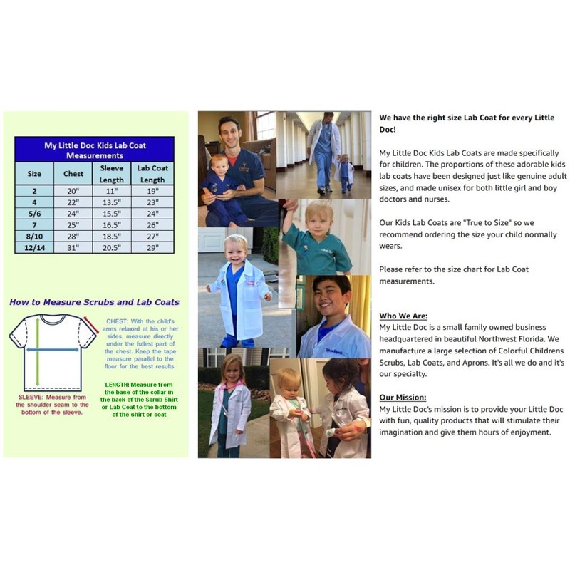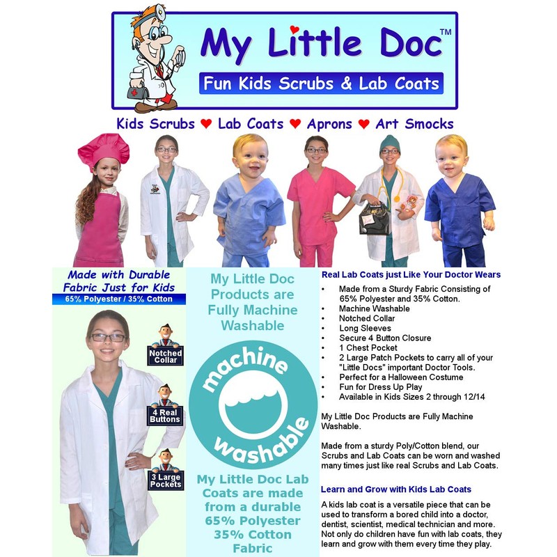 Why buy a "Costume Quality" Lab Coat when you can have the real thing? My Little Doc Brand Kids Lab Coats are Authentic Lab Coats just like the real ones. These coats are made from quality fabric containing 65% Polyester/35% Cotton and are fully Machine Washable. They have classic styling with one Chest Pocket and two side pockets.
