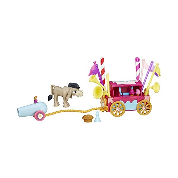 Welcome to Sugarcube Corner, where it's time to roll out the Welcome Wagon for Cranky Doodle donkey! This festive welcome wagon set comes decorated with horns, poles, and flags -- and don't forget the party cannon! Imagine throwing a big party in Ponyville when Cranky Doodle donkey comes to town with the My Little Pony Friendship Is Magic Collection Welcome Wagon set and included Cranky Doodle donkey figure. My Little Pony and all related characters are trademarks of Hasbro.