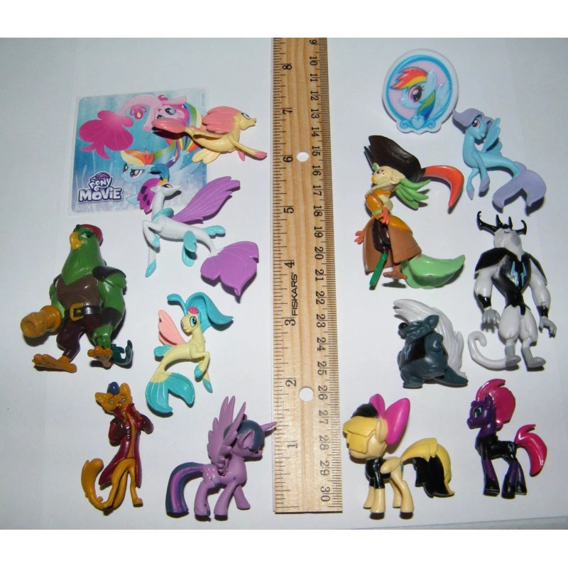 Product Description: This listing is for a deluxe set of fun party favors from the new hit My Little Pony The Movie! These "Magical" party favors include 12 nicely detailed mini movie figures, a special My Little Pony Movie Sticker and a collectible My Little Pony toy ring! These are great for any My Little Pony fan and will be played with long after the party is over! These fun figures are about to 1 to 2.5 inches tall and some are self standing but some may need to be hand held like the Seaponies. Please note the items are nicely shipped in plastic as pictured with no box. The My Little Pony Movie is all about how Twilight Sparkle and her friends have to go on an adventure in order to save their beloved homeland Equestria! This fun set of figures helps you to recreate this great movie. This kit includes all the popular characters including Twilight Sparkle, Tempest the Unicorn with the broken horn, Grubber her assistant, Capper the Cat, Pirate Captain Celano, first mate Boyle, Queen Novo of the Seaponies, Princess Skyster, 2 other Seaponies and more! These nicely detailed figures are made of hard plastic for hours of fun play time. Also included is a special 2.5 inch My Little Pony Movie sticker and a collectible My Little Pony toy ring. This neat hard plastic ring is open ended so it fits most sizes. The sticker and ring are randomly inserted so you may or may not get the ones pictured. These My Little Pony The Movie favors will help make any party a success! Please note these are for children and adults 4 and older! Do not miss out on this fun collectible My Little Pony The Movie Party Favor Set of 14 with figures, Special Sticker and a collectible My Pony Ring!