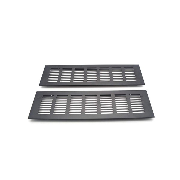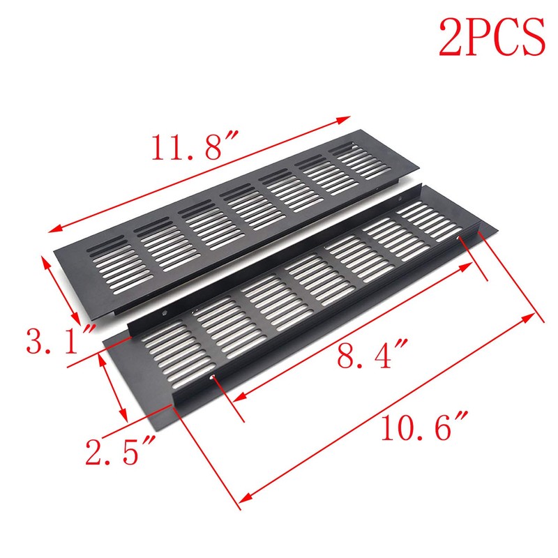 **Features:** Ideal for ventilation of closed spaces,such as cabinet,shoe cabinet,wardrobe,etc. **Specification:** Net Weight:151g Color:Black Material:Aluminum Alloy Thickness:1.2mm/0.05" Mounting Hole Diameter:3mm/0.12" Mounting Hole Distance:214mm/8.4" Total Size:300 x 80 x 14.5mm/11.8" x 3.1" x 0.6"(L*W*H) Fit for Install Hole Size:268 x 63 x 13.2mm/10.6" x 2.5" x 0.5"(L*W*H) **Package Includes:** 2 x Vent Cover **Note:** Due to the manual measurement,there may be small deviations. The color may have different as the difference display,please understand.
