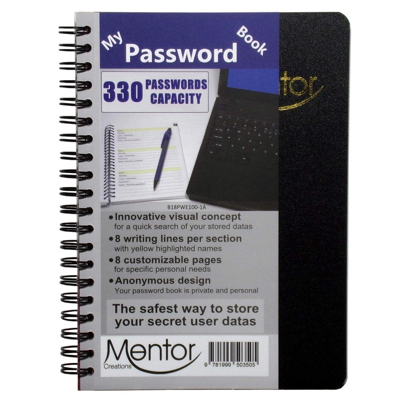 - Designed in Canada. 130 pages total. Ideal size and writable space to write down long passwords, now more requested, long website addresses and multiple security questions.