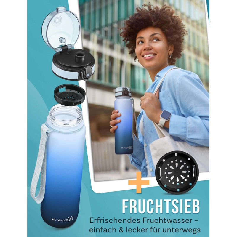 - Many possibilities: whether with a pop-up straw, fruit strainer, or just as it is, with the My Vesperbox drinking bottle, everything is possible. The water bottle also fits perfectly into most bicycle bottle holders.