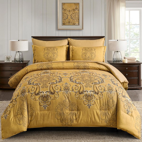 Mybedsoul Gold Queen Comforter Set, 7 Pieces Boho Bed in a Bag for Queen Bed, Damask Comforter with Sheets Pillowcases, Soft Microfiber Lightweight Bedding Sets for All Season(90"x90")