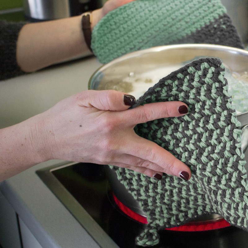 myboshi Toyokawa Pot Holder Crochet Set, Includes No. 2 Wool, Needle and Instructions, Crochet Pack, 85% Cotton, 15% Kapok Green, Grey with Crochet Hook