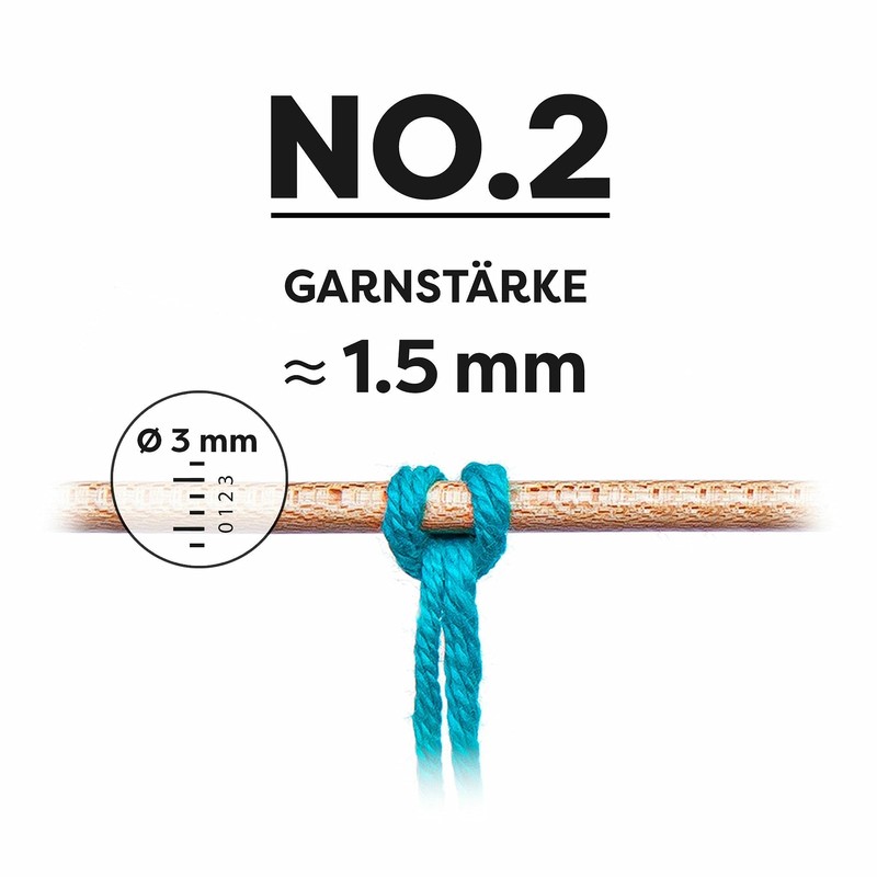 • Basics: with a running length of 100 m to 50 g, the No.2 yarn is very light and fine. It is washable up to 60 degrees, dimensionally stable and is therefore also skin-friendly and saliva-resistant.