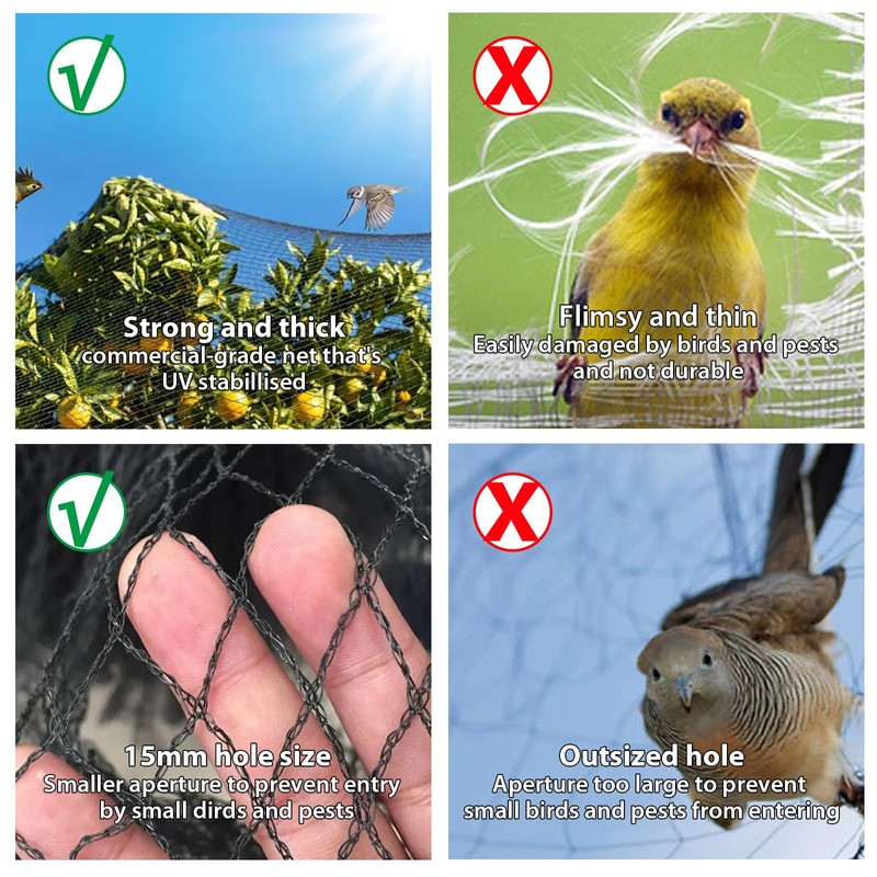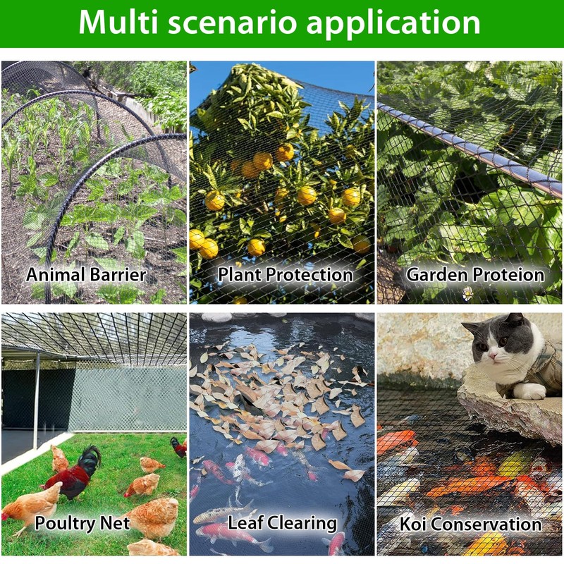- 【Application Scenarios】This orchard net is used as blueberry netting, tomatoes netting, cherry netting and bird netting for fruit trees , anti bird netting, koi pond netting, cover on chicken coop run, deer fence, ect. Don’t let birds, hawk and other wildlife ruin your harvest and feast on your produce.