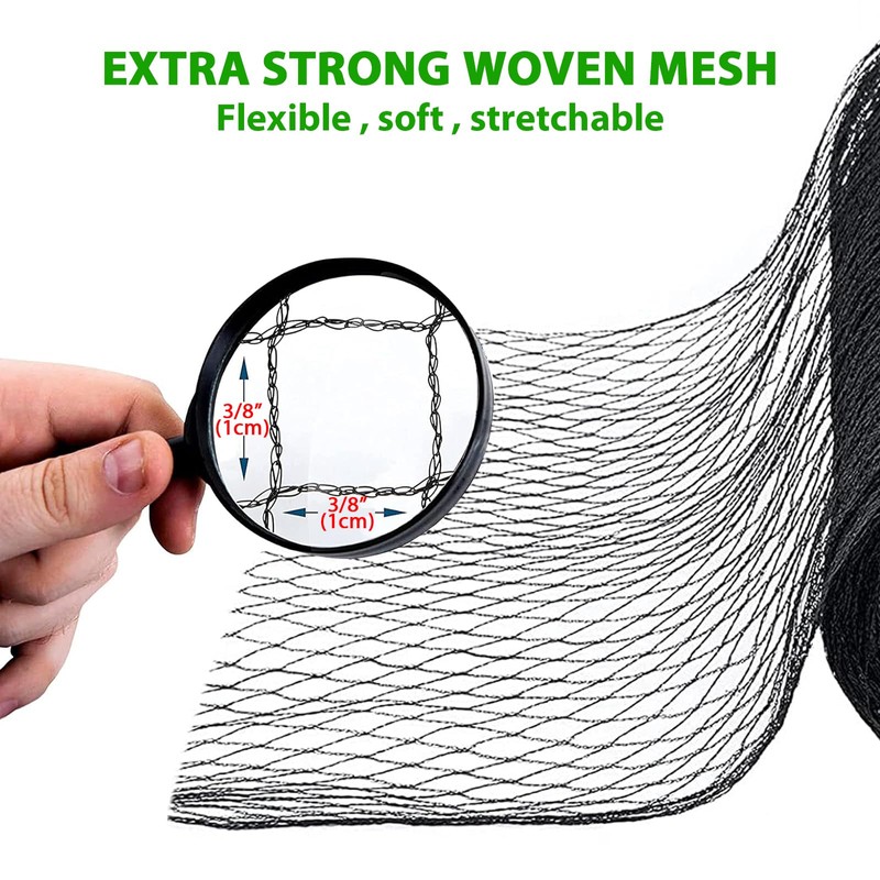 - 【3/8 inch woven Mesh Netting】The extra strength comes from a tightly woven mesh net. This adds tensile strength which gives it a unique stretch for durability.Our 3/8 inch mesh netting offers maximum protection without harming birds and small animals or interfering with plant growth. Serves as an outdoor cover like a fence or bird-proof barrier, a wildlife-friendly physical barrier to stop animals from damaging garden areas.