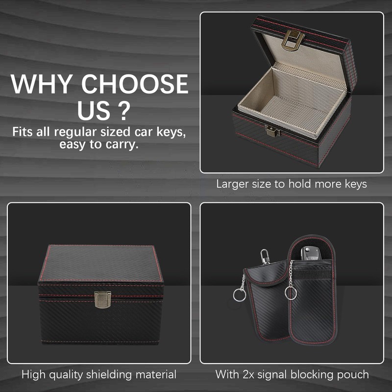 • 【Portable and Convenient, Hassle-free on the Go】Each Faraday box comes with two portable small carbon fiber pouches, measuring 3.74 inches in length and 5.91 inches in width. The carbon fiber pouches can be stored inside the box for double protection. Meanwhile, the included metal keychain and metal hook design make it even more convenient to carry, safeguarding your belongings anytime, anywhere
