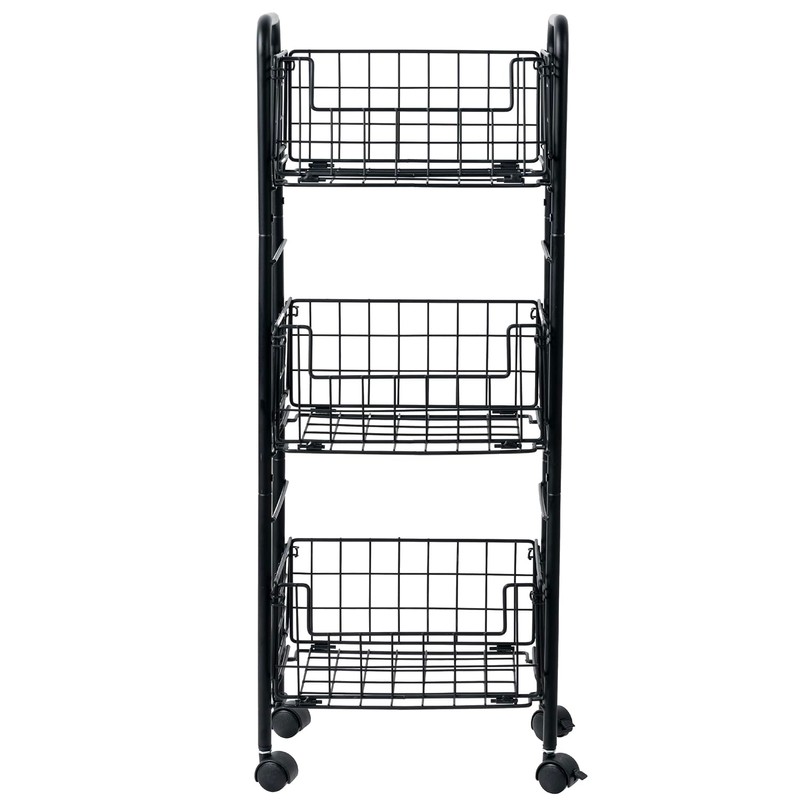 - 3-tiered matte black metal wire basket cart keeps fruits, vegetables, and pantry staples organized in a home kitchen or commercial setting **Some assembly required**
