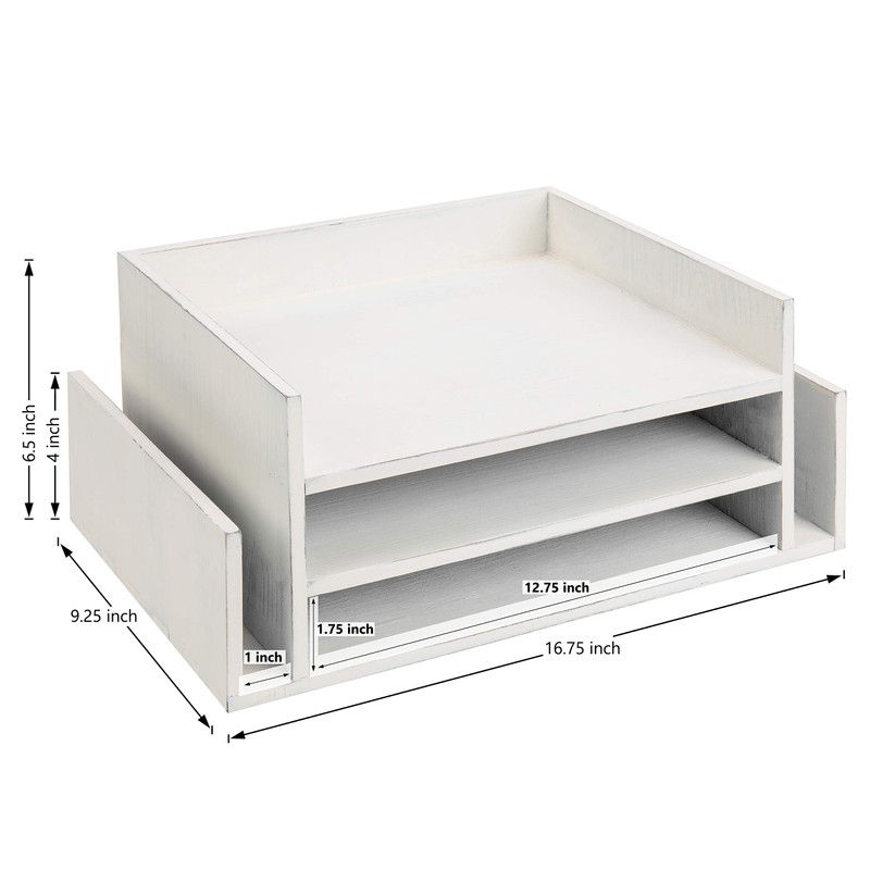 - 3-tier wooden desktop document tray with side letter holders and weathered vintage white finish