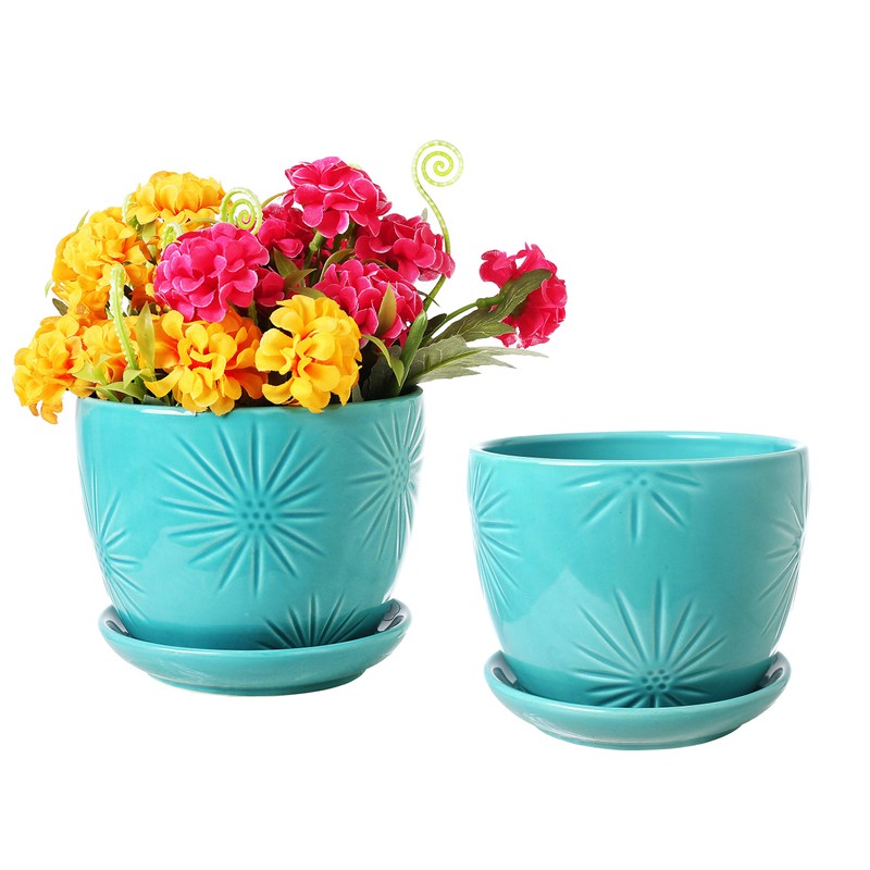 MyGift Aqua Sunburst Design Ceramic Flower Planter Pots, Decorative Plant Containers with Saucers, Set of 2