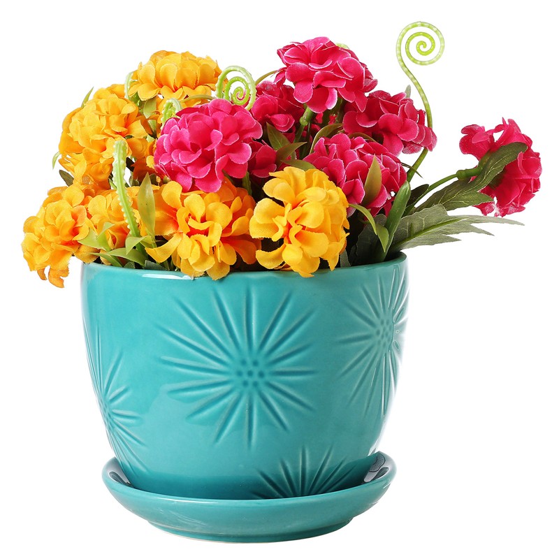 Ideal for everything from growing herbs in the kitchen or displaying succulents in the living room, this set of 2 planters brings a bright and cheerful style into the home. Each flower pot is made of thick ceramic with a glazed finish and a debossed starburst with a hint of vintage flair. A drainage hole at the bottom of each planter, along with an attached saucer, allows excess water to drain from the soil while ensuring none drips on table or counter surfaces. Bring vibrant plant color and a fun retro look to even small spaces with these mini ceramic planters. Approximate Dimensions (each pot, in inches): 4.3 H X 5.2 Diameter.