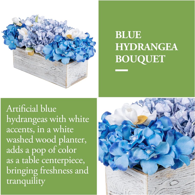 - Faux floral arrangement of blue hydrangeas with white magnolia accents in a shabby whitewashed wooden planter for indoor tabletop home decor