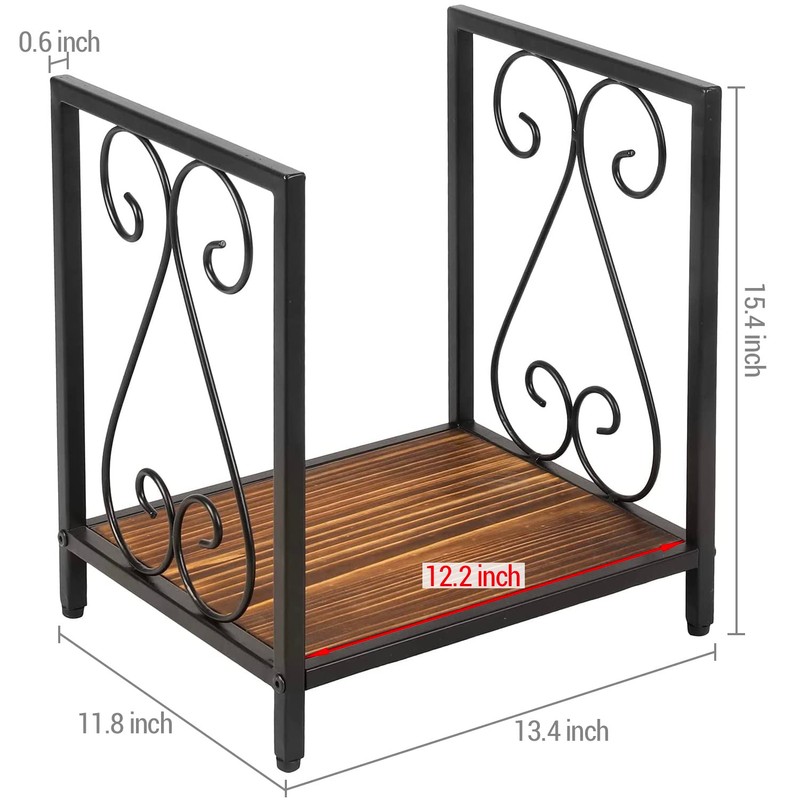 - Deluxe scrollwork design matte black metal frame and dark brown burnt solid wood base freestanding firewood log holder, ideal for storing your firewood logs