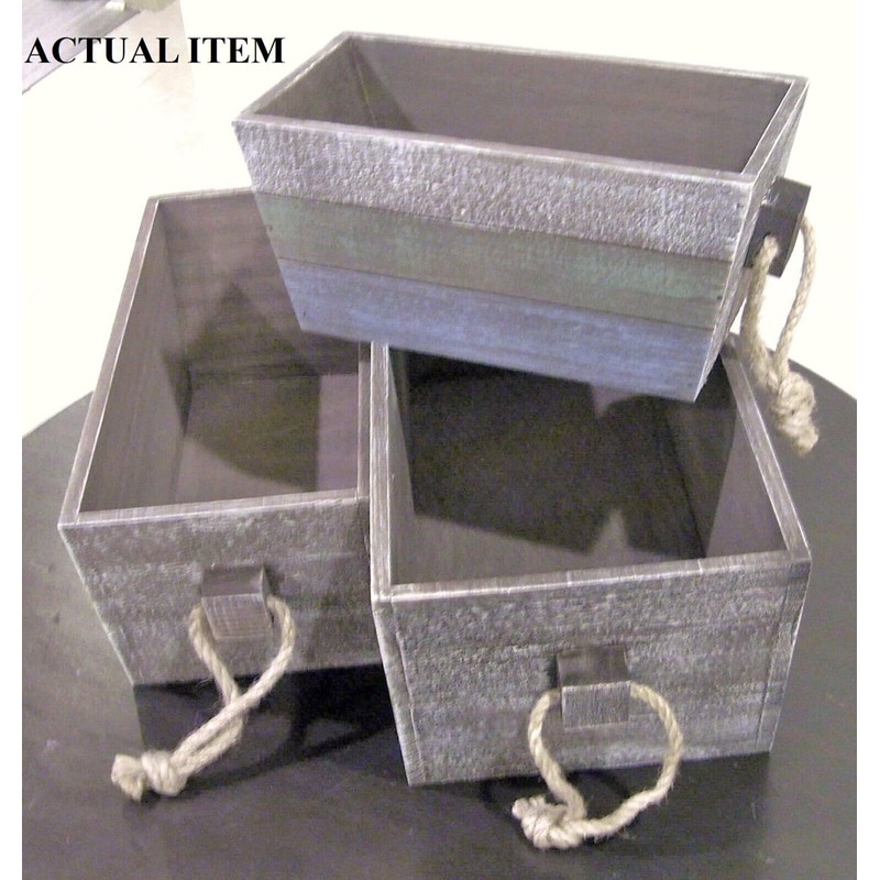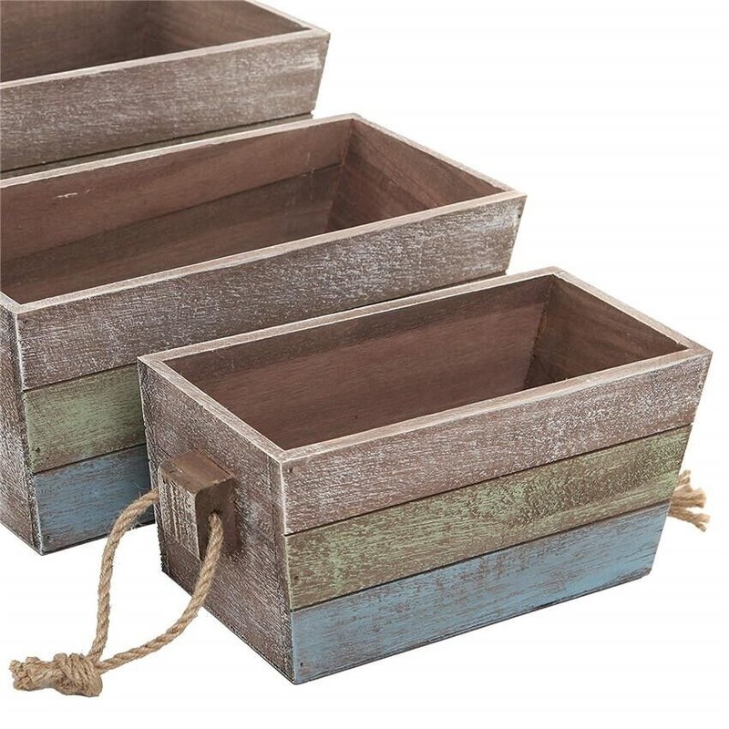 Set of 3 multicolor Brown/Blue/Green wood nesting boxes/crates/baskets with rope pulls/handles.