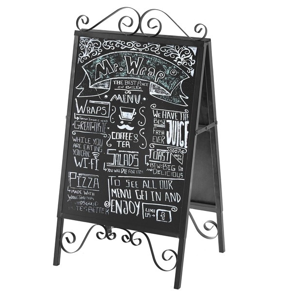MyGift Scrollwork Design Large A-Frame Black Metal Freestanding Chalkboard Sign/Decorative Restaurant Menu Sidewalk Message Board