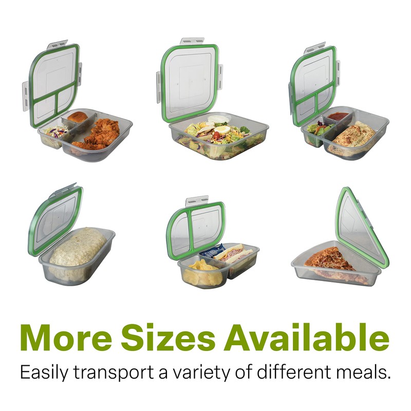 - SPILL RESISTANT: The gasketed lid creates a spill-resistant seal and is further secured with three hinged, snap-tight tabs to keep containers tightly closed in transit. Interior compartments are sealed off, allowing entrees and sides to stay separated, even sauces and dressings. This item is spill resistant not leak proof, not intended to store water.