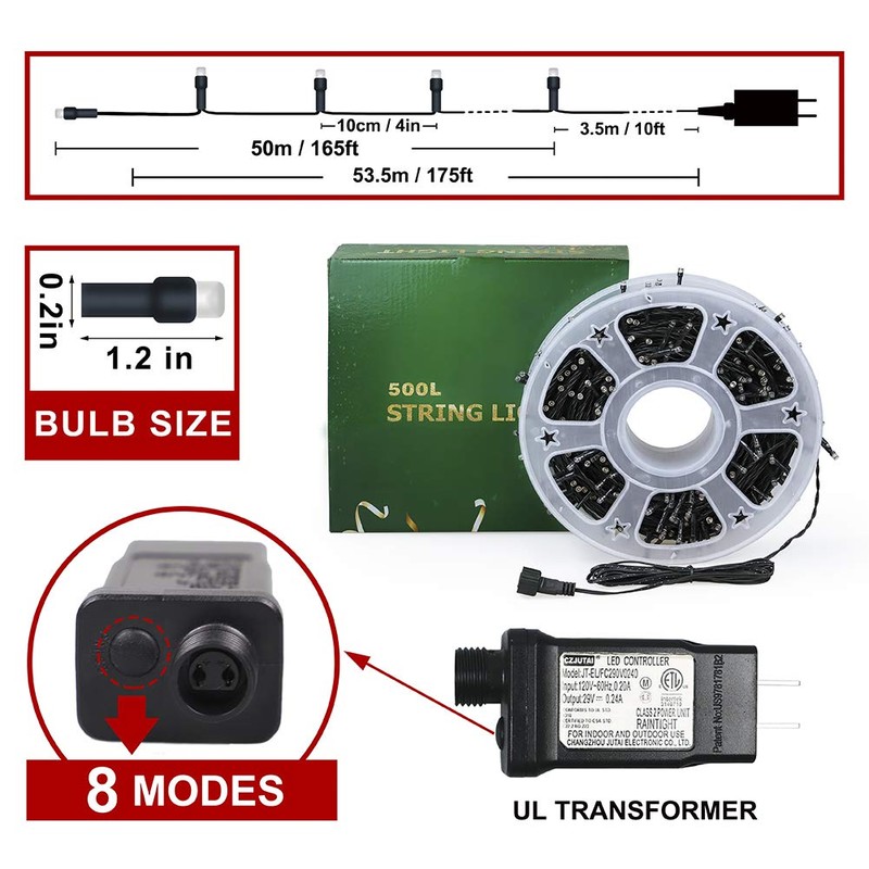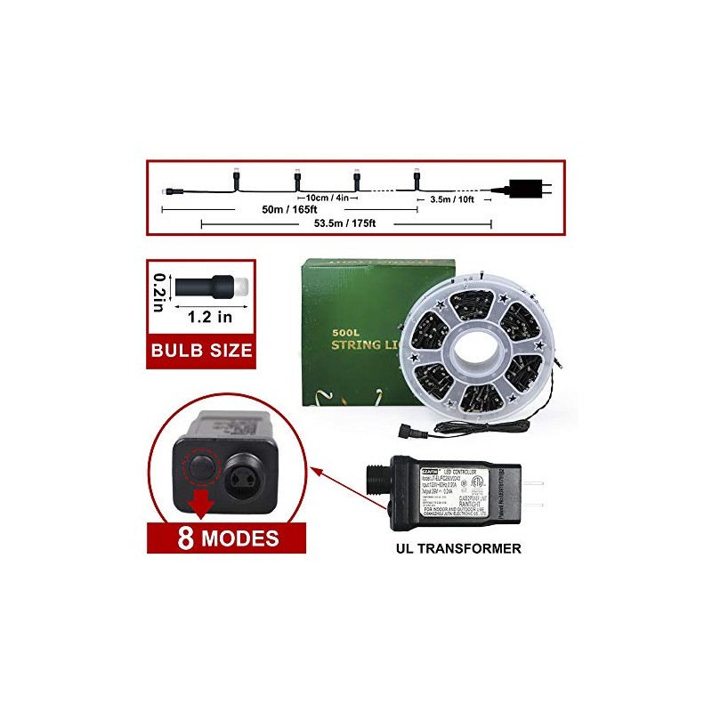 - ★500L White Christmas Lights★:Come on a storage wheel with UL Safe Plug powered 165ft/50m long green wire with 500 led lights, can be decorated in dark corners, living room or around a tree in yard.The distance between bulbs is about 0.33ft/10cm.