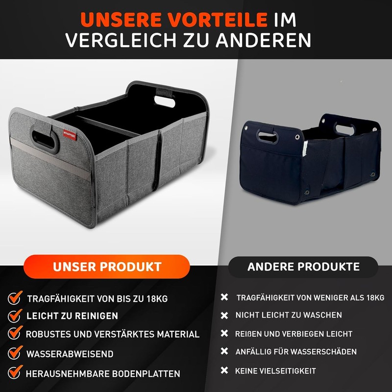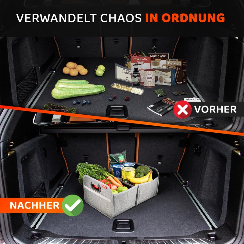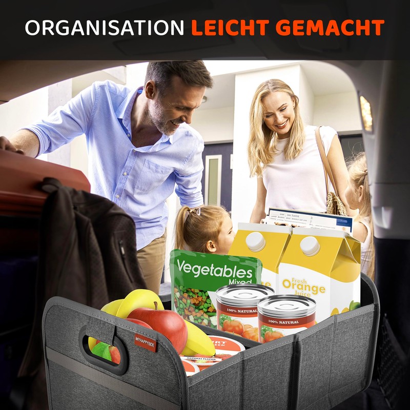 - Available in 3 colours: a colour for every taste. Our large boot organiser is perfect for shopping and fits perfectly in a shopping trolley. Also suitable for cleaning products, care products, tools, toys, camping equipment, office supplies and more!