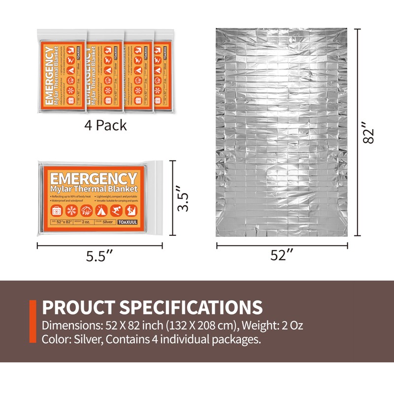 - Lightweight & Portable: The mylar blankets are lightweight, compact, Contains 4 individual packages, 82"x 52" & 2 oz.