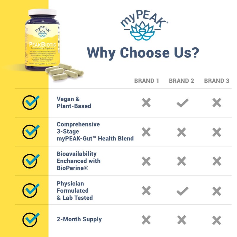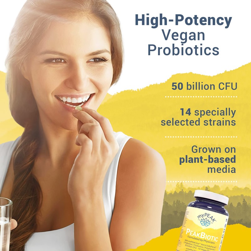 - Healthy Gut Means Healthy Body: Convenient, Comprehensive and Physician Formulated - PeakBiotic was made with your gut in mind. PeakBiotic combines comprehensive gut health supplements and mood probiotics, including pre and probiotics in just 1 pill a day. Hence, you can do more than survive each day. You can thrive, be great and live at your peak
