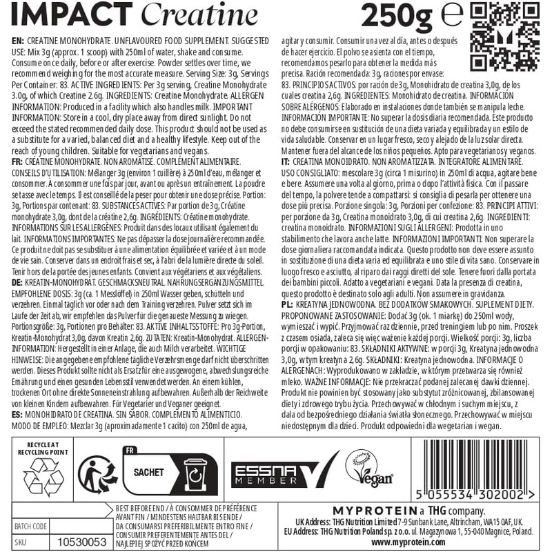 Myprotein Creatine Monohydrate Powder - 250g (83 x 3g Servings) - Pure Unflavoured - Scientifically Proven to Help Increase Power and Physical Performance