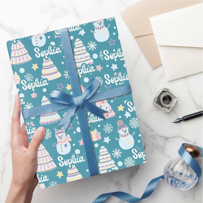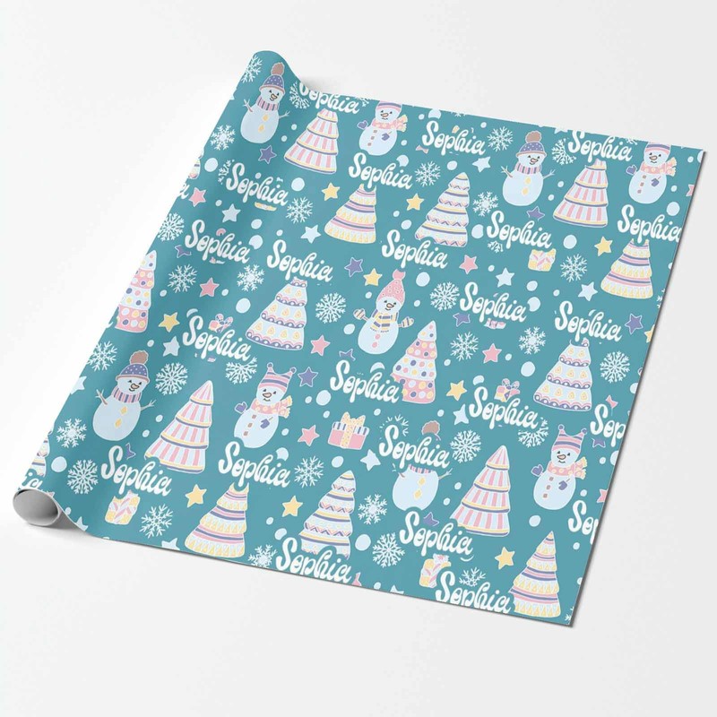 MyPupSocks Custom Christmas Wrapping Paper Snowman Snowflake and Pink Blue, Personalized Name Wrap Paper Funny Wrapping Paper Roll 58x23 for Boys Girls Kids Christmas Festival Winter Holiday 3 Rolls