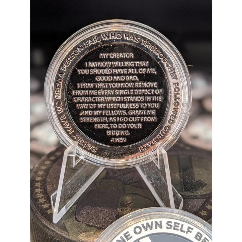 - 🙏 The 7th Step Prayer is elegantly engraved on the rear, along with "To Thine Own Self Be True" and the first line of "How It Works" from the Big Book of Alcoholics Anonymous.