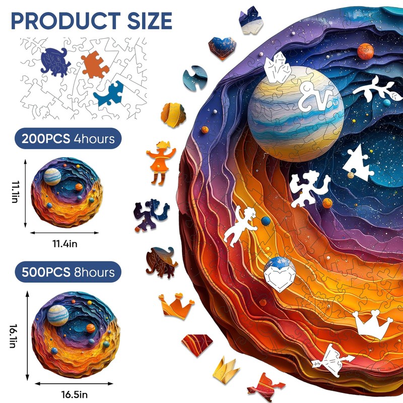 • 【500 Cosmic Pieces, Infinite Wonder】This wooden jigsaw puzzles dazzles with 3D Visual effect pieces featuring unique planets and hidden galaxy patterns. Assemble the solar system's beauty, perfect for space lovers and puzzle enthusiasts