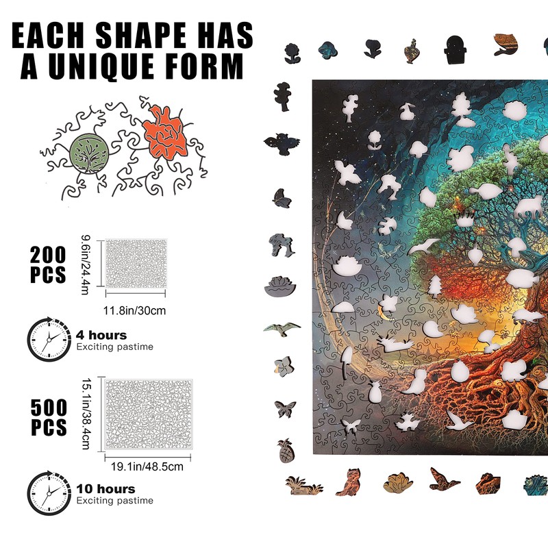 - UNIQUE WOODEN PUZZLE : The wooden jigsaw puzzle is inspired by nature, colorful, unique wooden puzzle. Original and vivid hand-painted art, which is fascinating and worthy of being used as an aesthetic home decoration. Mysterious patterns and small pieces of east eggs give you the ultimate puzzle experience.